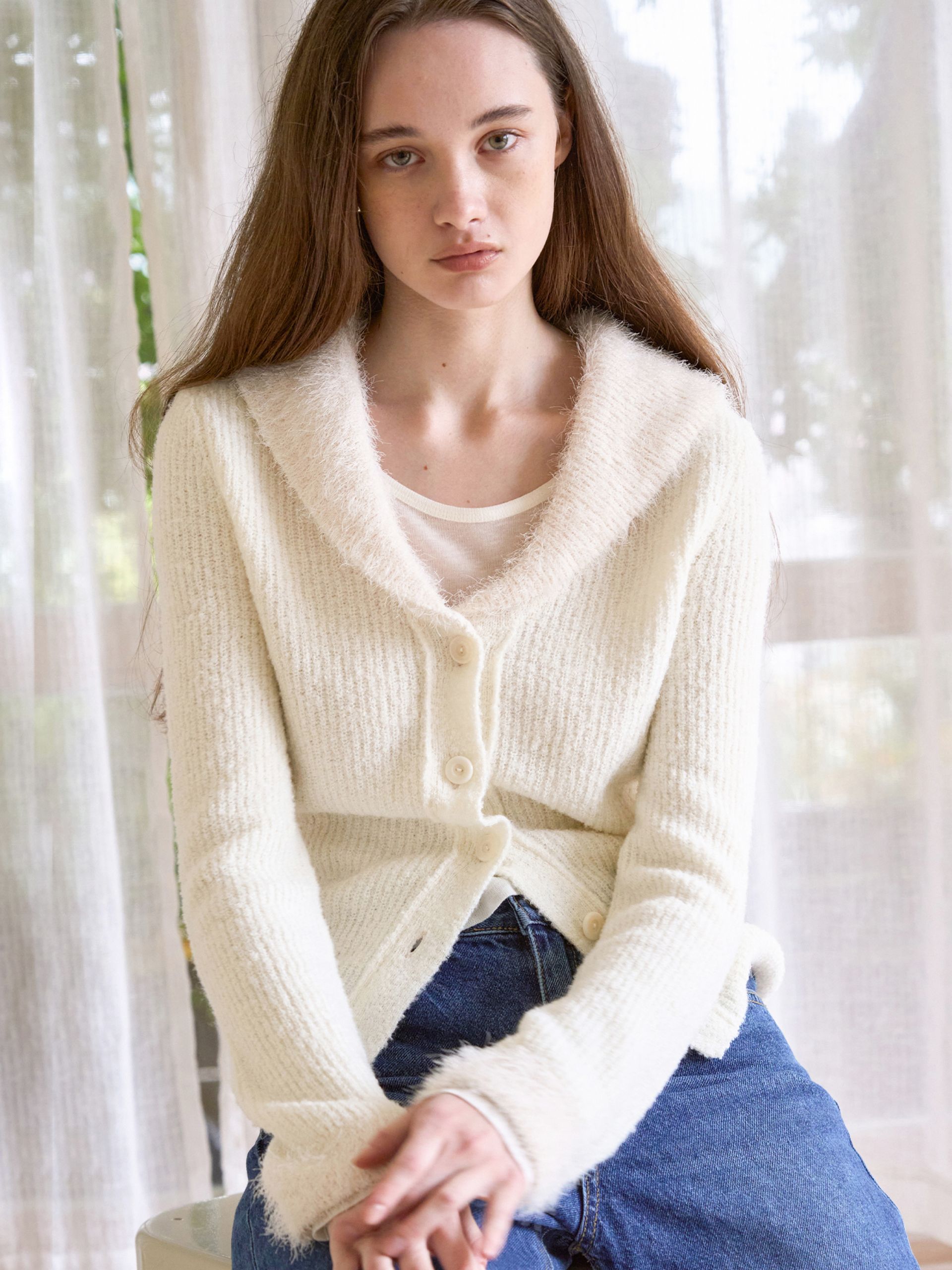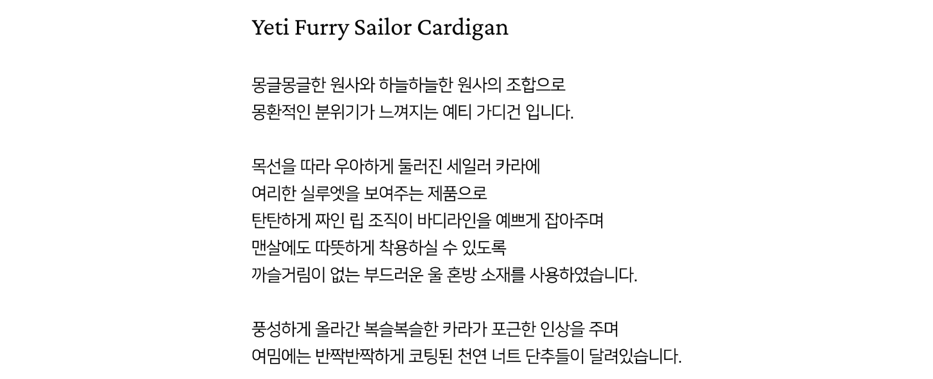 몽환적인 분위기가 느껴지는 예티 세일러 가디건 입니다.