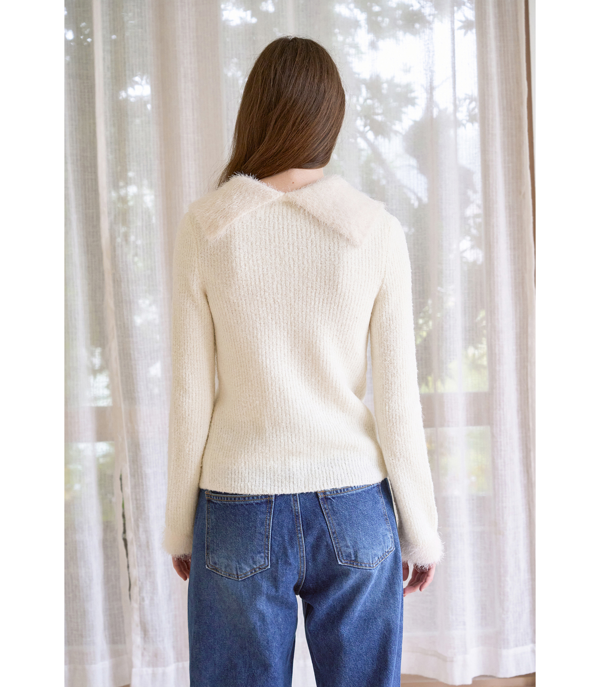풍성하게 올라간 복슬복슬한 카라가 포근한 인상을 주며